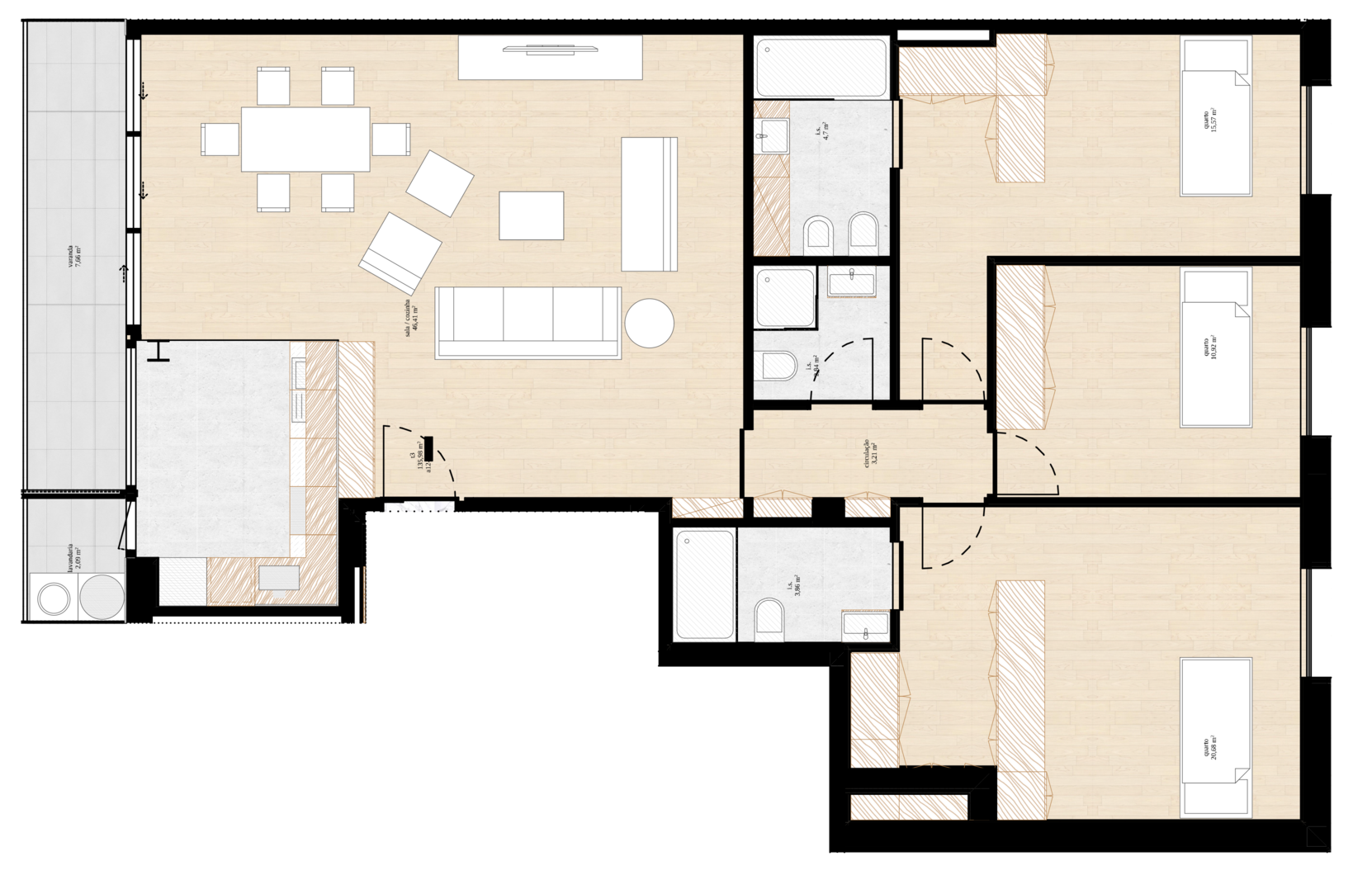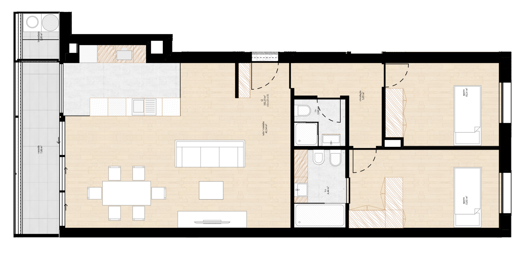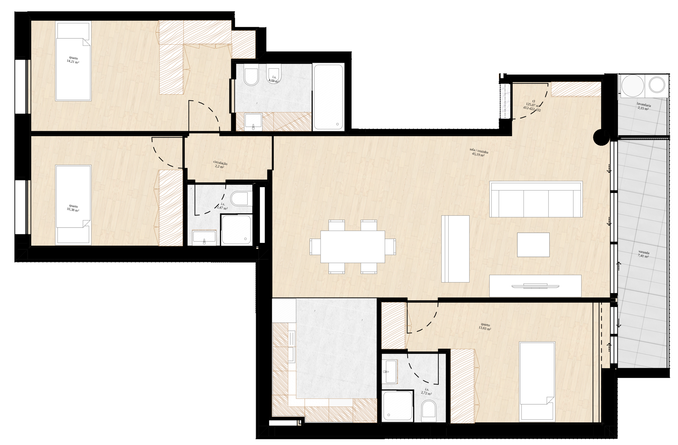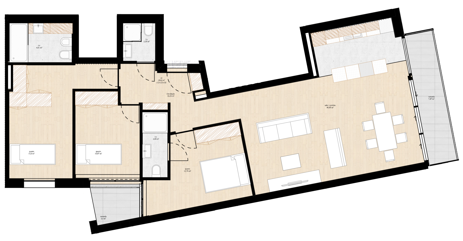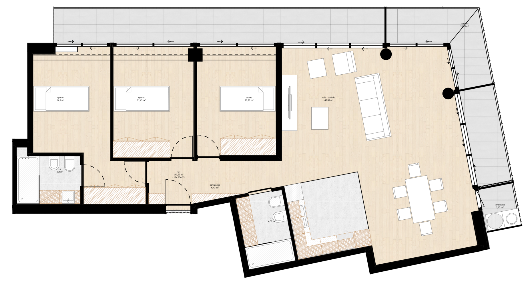 Os pavimentos da sala, quartos e vestíbulos de circulação serão soalho flutuante.
